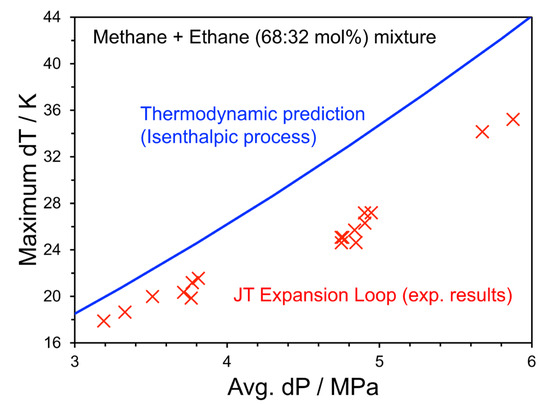 Figure 3 presents a summary of all dry gas experiments performed as part of this work. Individual experiments are shown as crosses, while a model prediction of the thermodynamic JT temperature drop predicted using the CPA-Infochem implemented in Multiflash v7.0 is shown as a solid blue line. The Multiflash prediction represents an upper expected limit to the temperature reduction in the system, as it represents the perfect cooling of an isenthalpic expansion of the fluid, whereas the temperature sensors in the apparatus are placed on the outer surface of the test section. In general, we expect that, given the JT coefficient of this mixture is positive, a greater pressure differential will directly correspond to an increased temperature differential. This behavior is observed, where an increasing deviation is also noted between the data and model at higher differential pressures. There are several likely contributing factors to this behavior. First, in the experimental setup, the expansion at a constant enthalpy is challenging due to dynamic effects associated with changes in kinetic energy (flow rate) and heat transfer. Smith [43] described that the measured temperature change along with pressure drop depends on a path, where a fluid system flows between pressure and temperature sensors. Also, the deviation may be related to the effect of the sensible cooling required by the steel pipeline. As the enthalpy lost by heat transfer to the pipe depends on the temperature difference between the fluid and the wall, which is not independently measured in our system: this term is difficult to estimate.