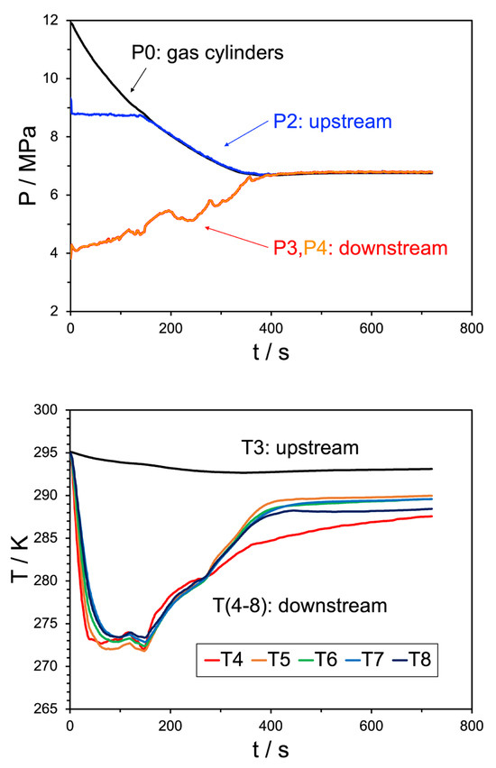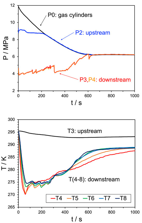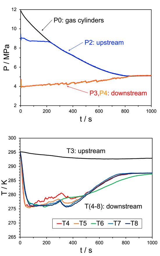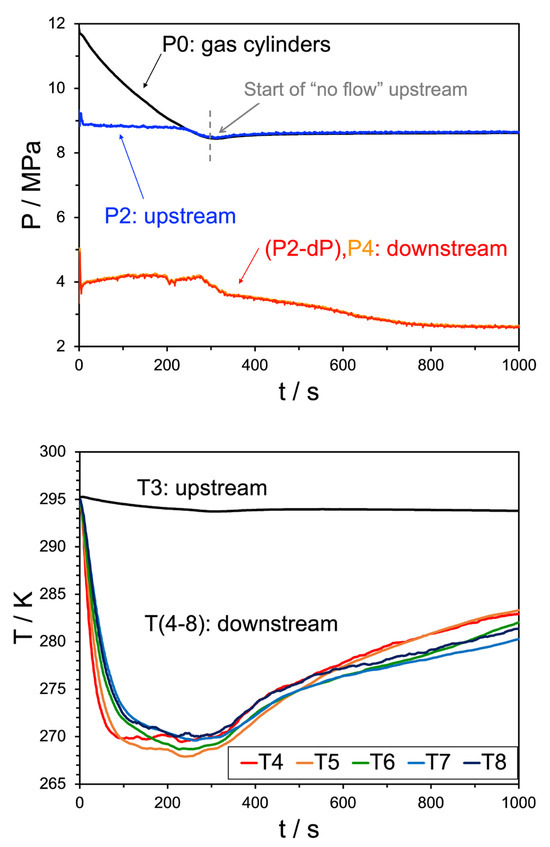 Initial experiments were performed at a low water injection rate of 10 mL/min, which was sufficient for rapid plugging to occur in the system. Figure 4 and Figure 5 show the pressure trend behavior (upper pane) at the bottle, upstream (post-PR) and downstream (pre-BPR) sensors and temperature trends (lower pane) measured at the location of T3, upstream, and downstream of the expansion valve, from T4 to T8, of two separate experiments. The upstream and gas bottle pressures converge over the first four minutes, which is nominally the steady state envelope for these experiments. The downstream pressures (orange and red) overlap as there is insufficient distance between them for frictional losses to play a role—this overlap indicates that there is no blockage or flow disruption between P3 and P4. Regarding downstream temperatures, the rate of cooling at the location of T4 was suppressed at approximately 100 s. This could be due to the exothermic nature of hydrate formation. Other locations were observed to cool further, which was attributed to a secondary expansion induced by the hydrate plug. Further, the agreement between the two experiments suggests a high degree of repeatability within the apparatus.