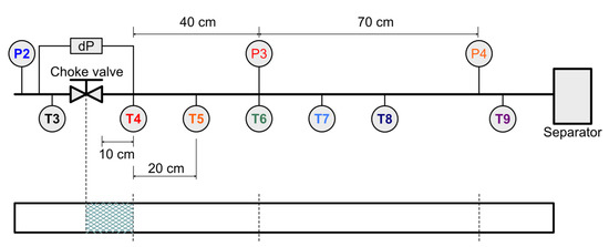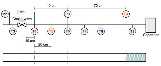 Downstream test section of the Joule Thomson expansion loop with temperature and pressure sensors indicated. The lower pane shows the estimated location of the resultant hydrate plug based on pressure signals, corresponding to Experiments 22, 24 and 27.