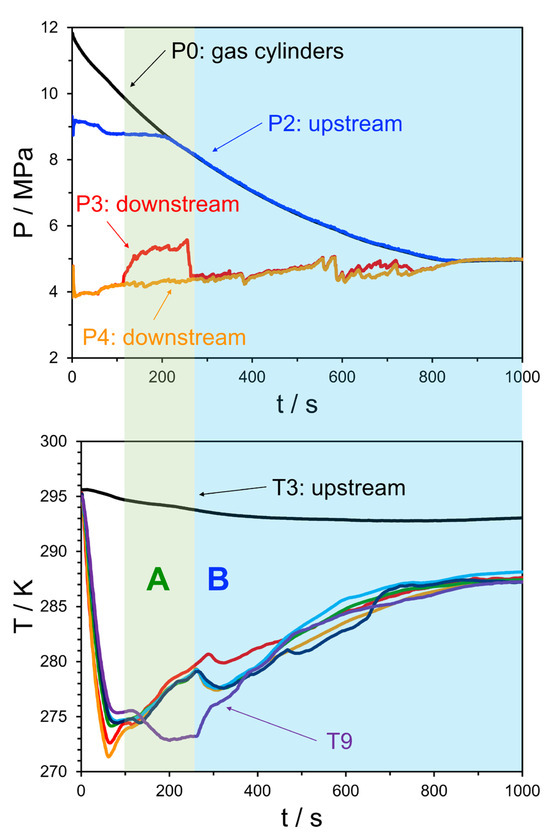 Top pane: pressure trend behavior for Experiment 27. The black line indicates the source bottle pressure, before the initial regulator, the blue line shows the pressure after the regulator but before the JT valve, the red and orange lines (overlapping) are the pressures downstream of the JT valve. Bottom pane: temperature trend behavior for the same experiment, where the black line indicates the upstream temperature and the remaining colors correspond to the temperature sensors shown in Figure 10. The water injection rate was 100 mL/min.