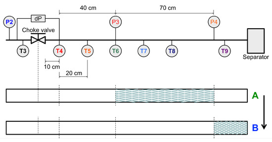 Downstream test section of the Joule Thomson expansion loop with temperature and pressure sensors indicated. The lower pane shows the location of the resultant hydrate plug corresponding to Experiment 26 (Figure 11), where the shift from A to B indicates how the hydrate plug might have been dislocated during the experiment.