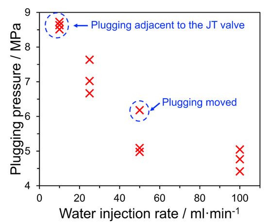- The rate of plug formation was shown to be inversely proportional to the water injection rate, where the plugging pressure was approximately halved as the water injection rate increased by an order of magnitude. This was likely due to the increased subcooling and/or finer atomization experienced in systems with lower water rate flows, which leads to shorter, faster-growing plugs immediately following the expansion valve.