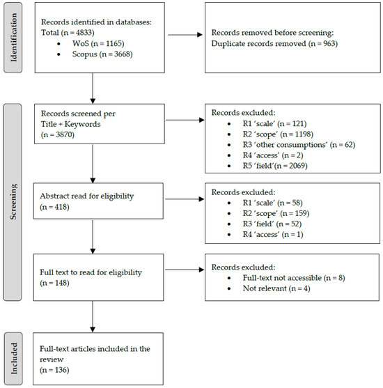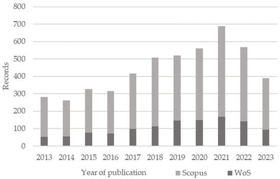 According to the research workflow presented in Figure 1, a systematic literature review was performed in Web of Science (WoS) and Scopus (stage 1). Science Direct, Research Gate, and Google Scholar were also considered, but then not included as the first is very similar to Scopus; the second is a voluntary repository which might not be fully updated; and the third is not properly structured with filters to scan and select the wide number of expected records. The two selected electronic databases are widely used in bibliometric analysis and considered highly authoritative and credible in academia as they include peer-reviewed records and are managed by third-party entities [33,34,35,36].