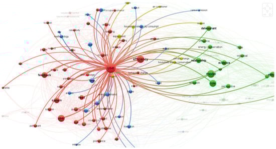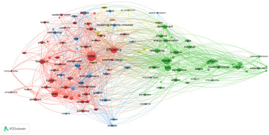The red cluster refers to terms pertaining more to the technological/physical dimension of energy conservation, such as: ‘use’, ‘feedback’, ‘efficiency’, and ‘system’. However, a strong user-center approach emerges in this group by terms such as ‘user’, ‘preference’, and ‘profile’. The green cluster is more related to social sciences/intangible aspects and behavioral theories, being the mainstream items ‘model’, ‘role’, ‘attitude’, ‘determinant’, and ‘intention’. The blue cluster deals more with methodological aspects of the research in this field, with terms such as ‘question’, ‘barrier’, ‘target’, and ‘subject’, while the yellow one contains the remaining and less related terms.