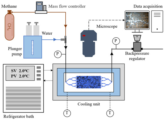 The computing domains and boundary conditions were created according to the segmented microscopic images captured during the dissociation of methane hydrate in a high-pressure micromodel. As shown in Figure 3, the experimental system is composed of a high-pressure micromodel, a microscopic imaging device, fluid injection equipment, a backpressure regulator, and a cooling system. The microfluidic chip is placed in the cooling unit filled with a glycol solution to control the required temperature through the refrigerator bath, ranging from 251.15 to 303.15 K. The pressure within the micromodel is controlled by the backpressure regulator, ranging from 0.1 to 5 MPa. The pressure at the inlet and outlet of the micromodel is measured by pressure transmitters with an accuracy of 0.25%, and the temperature of the micromodel is measured by Pt100 temperature sensors placed on the surface of the micromodel, with an accuracy of 0.02 °C.