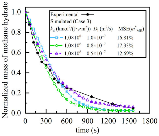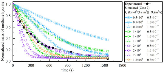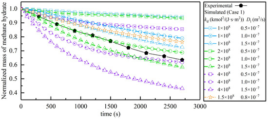 Figure 5 shows the normalized mass evolution during hydrate dissociation under a small pressure difference (0.8 MPa). When the effective diffusion coefficient is Dl = 0.5 × 10−7 m2/s, the normalized mass deviates most significantly from experimental data, where the simulated dissociation rate is much smaller compared to the experimental rate, irrespective of the rate constant. However, when the effective diffusion coefficient is adjusted to Dl = 1.0 × 10−7 m2/s, and the rate constant is established at kd = 2.0 × 108 kmol2/(J·s·m2), the normalized mass aligns most closely with the experimental data, exhibiting a mean square error of 4.08%. Further variations are observed for cases employing an effective diffusion coefficient of 1.5 × 10−7 m2/s, as detailed in Table 4.