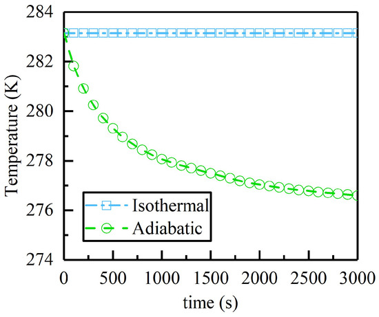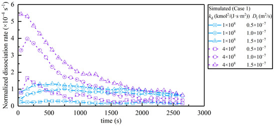 Meanwhile, Figure 6 compares the variation in the dissociation rate with the effective diffusion coefficient for different rate constant values of 1.0 × 108 kmol2/(J·s·m2) and 4.0 × 108 kmol2/(J·s·m2), respectively. The dissociation rate rises as the rate constant increases from 1.0 × 108 m/s to 4.0 × 108 kmol2/(J·s·m2), particularly before t = 600 s. Additionally, with an equivalent rate constant, the time-averaged dissociation rate also increases with the effective diffusion coefficient. These quantitative findings suggest that the dissociation rate is influenced by both the kinetics and diffusion in the initial dissociation period. At a rate constant of 1.0 × 108 kmol2/(J·s·m2), the dissociation rate displays minimal change over time. Conversely, the dissociation rate increases when the rate constant kd = 4.0 × 108 kmol2/(J·s·m2) decreases with time across all cases. This phenomenon is attributed to a substantial increase in the water layer thickness during rapid dissociation, leading to intensified diffusion resistance. It is noteworthy that, over time, the temporal dissociation rate tends to converge, regardless of the rate constant. Therefore, it implies that hydrate dissociation is predominantly governed by diffusion as the water layer thickens in the late stages of decomposition.