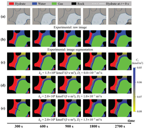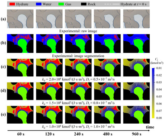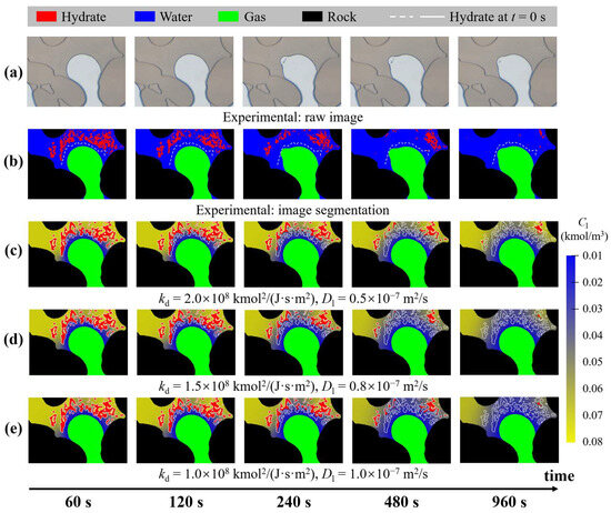 Comparison of experimental and simulated hydrate evolution in case 1, (a) raw experimental image, (b) segmented experimental image, and (c–e) simulation results of different rate constant and effective diffusion coefficient.