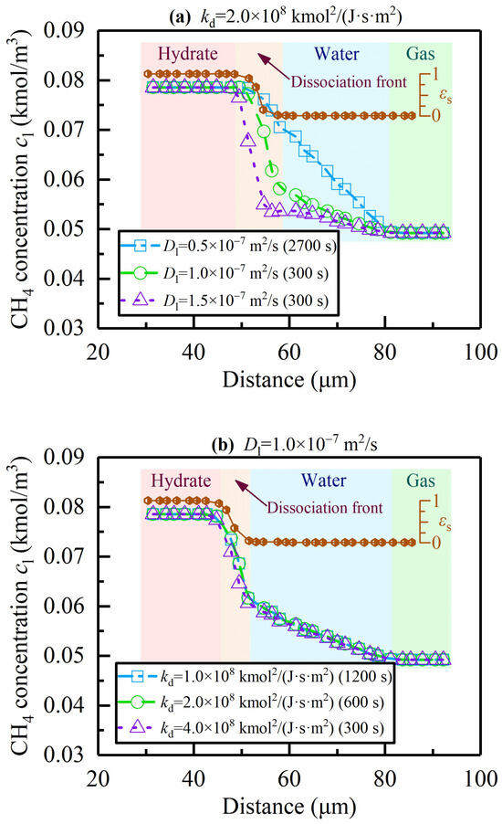 Furthermore, Figure 8 compares the concentration of methane dissolved along the direction of the water layer thickness for different values of the effective diffusion coefficient. The selection of simulation results at different time points ensures a consistent water layer thickness whenever possible. Observably, the hydrate at the dissociation front constitutes a porous region with an approximate thickness of 10 microns, wherein the volume fraction of the hydrate gradually transitions from 1 to 0. On the left of the dissociation front resides methane hydrate in the solid phase, exhibiting a methane concentration equivalent to the hypothetical equilibrium solubility of methane hydrate. With the increase in the effective diffusion coefficient, both the concentration gradient and the concentration proximate to the dissociation front diminish, thereby augmenting the driving force of hydrate dissociation. When the effective diffusion coefficient is fixed at Dl = 1.0 × 10−7 m2/s, the produced methane does not significantly increase in concentration near the dissociation front with the increasing reaction rate constant. Thus, the local concentration in the water layer near the dissociation front is mainly determined by the effective diffusion coefficient.