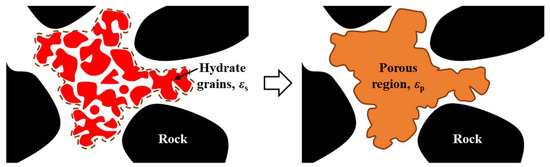 Loose hydrate particles usually contain sub-pore structures that are much smaller than the pores between sediment grains. If fine grids are used to characterize these sub-pores structures, the required grid number may be at least one order of magnitude higher than that of the sediment pores. To reduce computational resource consumption, it is feasible to replace the loose hydrate particles with a porous region with the porosity of their average volume fraction, as shown in Figure 11. The porosity and specific surface area of the porous region are calculated as follows: