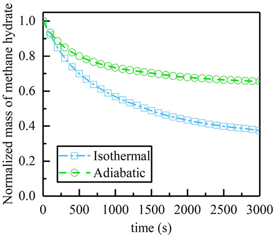 Normalized mass of methane hydrate dissociation under a small pressure difference (0.8 MPa).