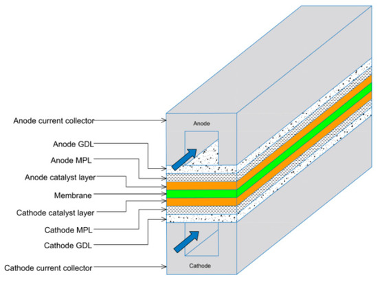 Schematic representation of a PEMFC, highlighting key components, including the MPLs and the gas flow highlighted by the blue arrows [9].