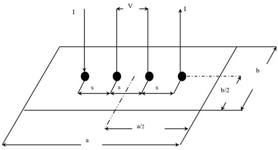 The correction factor also needs to be evaluated; it is a function of two ratios. The first ratio is between the length of the sample and its width (a/b). The second shows the ratio between the width of the sample and the spacing between the probes (b/s) [18]. In this study, these ratios were found to be 3 and 1.25, respectively. This gave a correction factor of 0.9973. The resistivity () can be calculated using the following formula [18]: