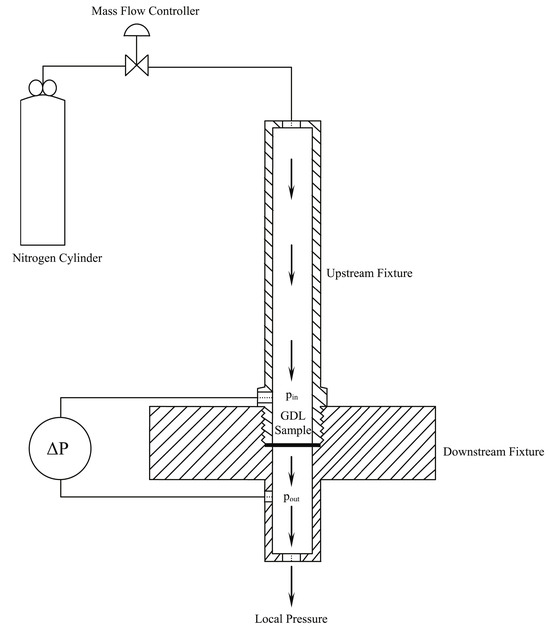 The permeability can be measured experimentally; Figure 4 shows an experimental setup used by Orogbemi et al. [21]. The GDL sample is clamped between two plates in the middle of the lower fixture, and nitrogen is then passed through using a mass flow controller [21].