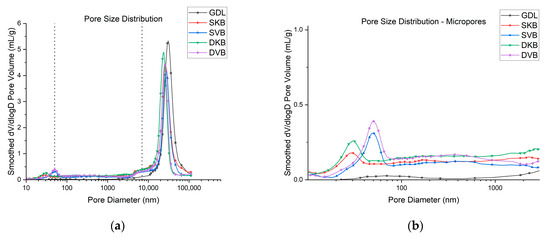 (a) Pore size distribution of the tested GDL samples and (b) micropores and mesopores ranges of the samples.