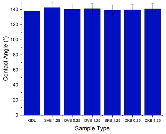 From the contact angle measurements (Figure 9), it can be seen that the addition of an MPL generally increases the contact angle. The uncoated sample of the GDL measures at 138° and the coated samples measure between 139° and 142°. This could be clearly attributed to the high amount of PTFE loading in the MPL (20 wt.%) compared to the carbon substrate (10 wt.%). Further, for the double-sided MPL-coated GDLs, the 1.25 mg/cm2 side was found to demonstrate a slightly higher contact angle than the 0.25 mg/cm2 side. This is most likely due to the fact that, as will be shown in the following micrographs, the MPLs with 0.25 mg/cm2 do not fully cover the surface of the carbon substrate, thus allowing for the structure of the carbon substrate (which has a lower contact angle) to lower the contact angle of the latter MPL.