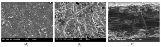 SEM images for (a) double-sided coated GDL with 1.25 mg/cm2 Ketjenblack, (b) double-sided coated GDL with 0.25 mg/cm2 Ketjenblack, (c) cross-sectional of double-sided coated GDL with Ketjenblack (d) double-sided coated GDL with 1.25 mg/cm2 Vulcan black and (e) double-sided coated GDL with 0.25 mg/cm2 Vulcan black (f) cross-sectional of double-sided coated GDL with Vulcan black.