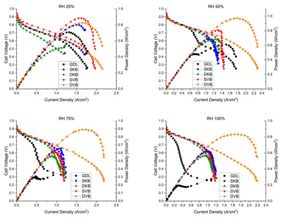 On the other hand, the fuel cell with a double-sided Ketjenblack-coated GDL does not perform as well as the double-sided Vulcan-black-coated GDL. The MIP results shown in Figure 8, show that the Ketjenblack GDL samples have only micropores that are smaller than those of the Vulcan black samples. Such small micropores on both sides of the GDL appear to act as a trap for liquid water, which is an issue at higher current densities. This premise is corroborated by the fact that the single-sided Ketjenblack-coated GDL performs slightly better than the double-sided Ketjenblack-coated GDL at high humidity conditions (75 and 100% RH), implying that the second MPL facing the bipolar plate hinders the removal of liquid water from the GDL.
