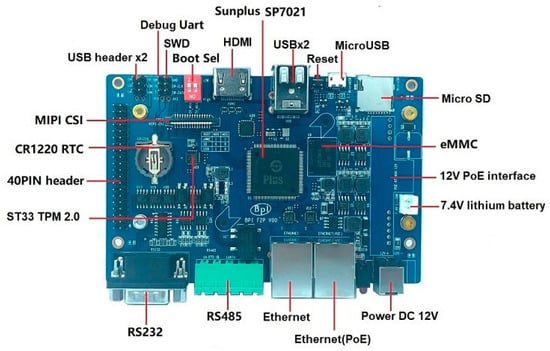 Figure 3: the CPU (Sunplus SP7021), the data storage unit eMMC where the OS is kept, the physical interfaces that will be used for the communication to external devices (RS232, RS485, Ethernet, 40 Pin header), the physical interfaces for the communication to management units and administration (Debug Uart) as well as other interfaces to external devices (USB, MicroUSB ports, MIPI CSI). Take into consideration that for a large-scale implementation, the final redesign of the SmG board will be a stripped-down version of such typical boards on the market, and will only include the controllers and peripherals needed for communication for the custom implementation and exclude all the unnecessary controllers and peripherals (sound, GPU, HDMI, Micro SD, USB ports, etc.), which will lower the cost of the board even more.
