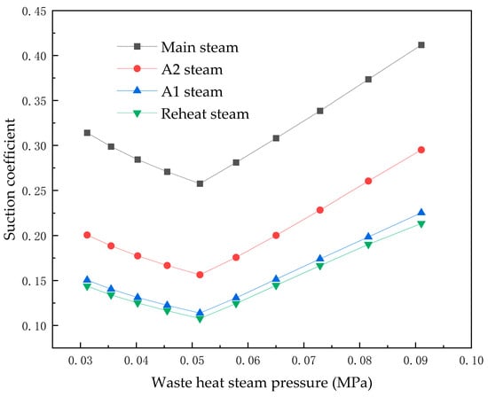 - When the waste heat steam pressure exceeds 0.05 MPa, there is a general decrease in the suction coefficient trend as the unit load increases at the same waste heat steam pressure.
