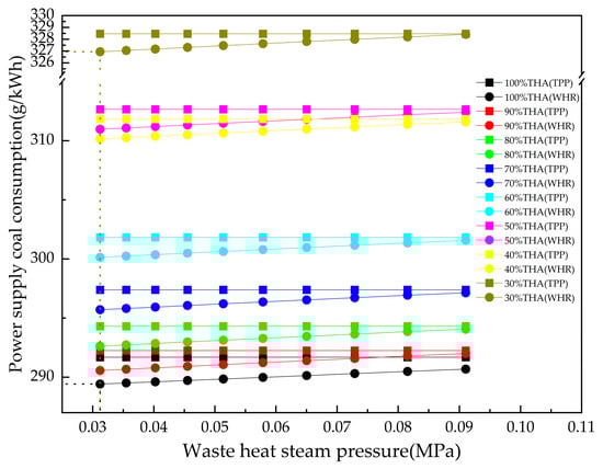 - The coal consumption of the power supply decreases proportionally with the diminishing waste heat steam pressure under the same unit load. When the waste heat steam pressure reaches 0.0312 MPa, the power supply’s lowest coal consumption is recorded at 289.43 g/kWh (100% THA), whereas the highest is recorded at 326.94 g/kWh (30% THA). In comparison with the initial TPP unit, the waste heat recovery system demonstrates varying degrees of coal consumption reduction, achieving reductions of 2.26 g/kWh and 1.52 g/kWh, respectively.