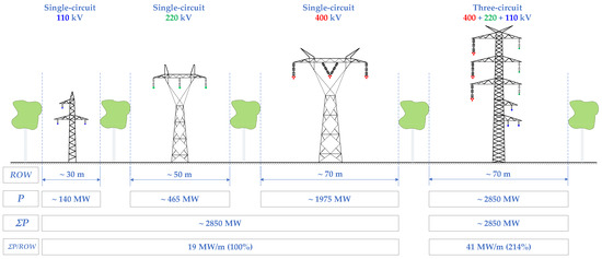 Figure 1. Visualization of the intensification of land use occupied by three single-voltage OLs compared to a three-circuit, three-voltage OL. Here, ROW denotes the right of way and P is the power capacity of the OL (assumed long-term permissible currents: 735 A for 110 kV circuits, 1220 A for 220 kV circuits, and 2850 A for 400 kV circuits). - reducing the impact of elements of the transmission and distribution network on the landscape and the natural environment by: