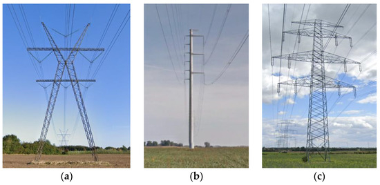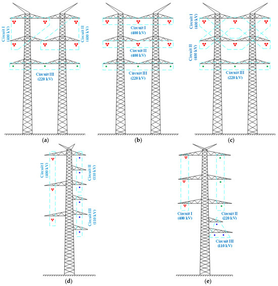 MMOLS with various degrees of geometric asymmetry: (a) double-circuit 400 + 150 kV (Switzerland); (b) three-circuit 400 + 2 × 110 kV (Poland); and (c) four-circuit 2 × 220 + 2 × 110 kV (Austria).