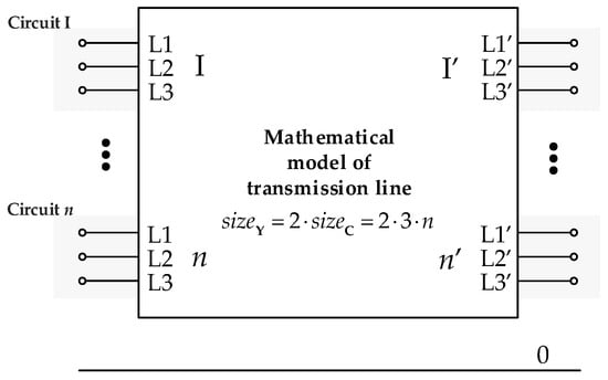 A phase-symmetrical OL is described by the admittance matrix for the phase quantities Y and the block diagram (Figure 3). This model is used for steady-state and quasi-steady-state analyses for the purposes of, among others: power load flow, development analyses of the transmission network, determination of the initial symmetrical short-circuit current, analysis of the selection of the cross-section of lightning conductors, etc. This type of model is often used in commercial software, among others, DIgSILENT PowerFactory in steady-state analyses. The method of determining the parameters of the Y admittance matrix of an OL is discussed, among others, in refs [13,14,31,45].