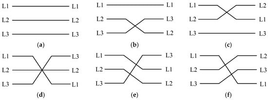 Types of transposition of phase conductors in the selected MMOL circuit: (a) no transposition; (b–d) transposition of a pair of conductors; (e,f) transposition of all conductors in the circuit.