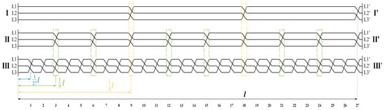 Figure 5 shows an example of full-phase symmetrization of a three-circuit OL. As a result of the full symmetrization of OL, each phase conductor successively occupies, over approximately equal lengths of the route, each geometrical position in the laying configuration. Next, from the general point of view, the MMOL is phase-symmetrical and can be described by a symmetrical model according to Equation (1). However, to obtain full phase-symmetry of the three-circuit OL, 36 transpositions of type (e) or (f) in Figure 4 should be made at specific, uniform intervals, which are made at 26 locations along the length of the line (2 transpositions in the circuit I, 8 transpositions in circuit II, and 26 transpositions in circuit III), according to Figure 5. Furthermore, if, at the other end of the OL, it is planned to keep the phase configuration identical to the one at the beginning of the OL, additional 3 transpositions should be made in each of the line circuits (Figure 5—location marked with number 27). In this case, the following should be performed in total: 3 transpositions in circuit I, 9 transpositions in circuit II, and 27 transpositions in circuit III, while maintaining appropriate equal intervals between individual transpositions.