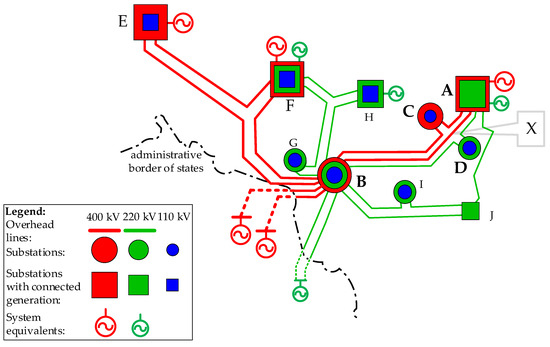 To verify the proposed method for minimizing the effects of geometric asymmetry of MMOLs, an analysis of the operation of the three-circuit, two-voltage (2 × 400 + 220 kV) OL in the real transmission network was performed. The analyzed system is shown in Figure 6. The presented system represents a fragment of the transmission network in Poland. The names of individual power stations have been changed. The MMOL connecting stations A and B, with a length of 75 km, is planned to be introduced into the Polish transmission network in 2032 [47].