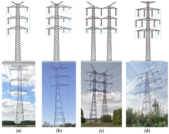 Examples of an MMOL characterized by a small degree of geometric asymmetry: (a) double-circuit 400 + 220 kV OL in a vertical arrangement; (b) three-circuit 400 + 220 + 110 kV OL in a vertical arrangement; (c) three-circuit 2 × 400 + 220 kV OL in a flat arrangement; and (d) four-circuit 3 × 400 + 220 kV in a vertical arrangement.