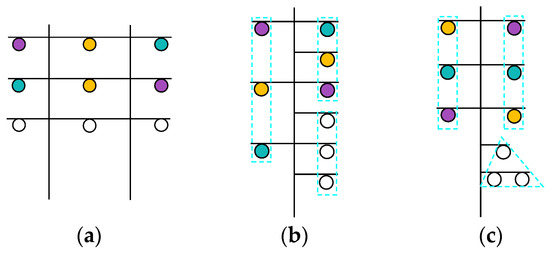 Phase configurations for the analyzed supporting structures characterized by central symmetry in other circuits: (a) for silhouettes a–c, (b) for silhouette d, (c) for silhouette e.