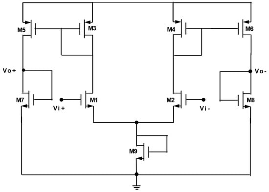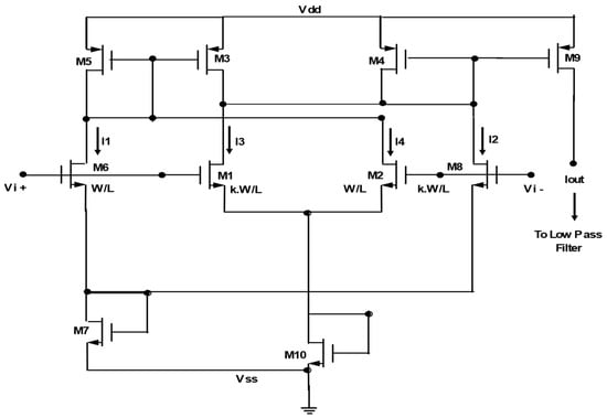 A traditional LA design with NMOS as the load transistor [] has certain advantages; for example, it is easy to adjust its gain. However, the LA shown in Figure 3 is more convenient for the proposed application, as the NMOS load transistors in the limiting cells [] suffer from the body effect, which impacts the gain and threshold voltage [], resulting in (i) the need for higher power supply voltages to keep the transistor in the saturation region and (ii) higher power consumption for the given specification. The LA used in our design (Figure 3) has current mirrors formed by the combination of M3–M5 and M4–M6 which eliminate the body effect, enabling it to operate with a low power supply. However, by carefully choosing the transistor widths of the limiting cell shown in Figure 3, the gain of the amplifier is designed to be less than 1 (~0.3), unlike those in previous works where the limiting cell gain is more than 1 [,]. This is to ensure the proper rectification of the full-wave current rectifier (subsequent stage), as the input levels required are small in magnitude. Another reason for choosing such a design is it provides a high common-mode rejection ratio, a high power supply rejection ratio, and a large dynamic range due to its differentiality in nature [,].