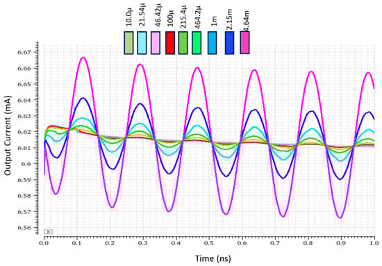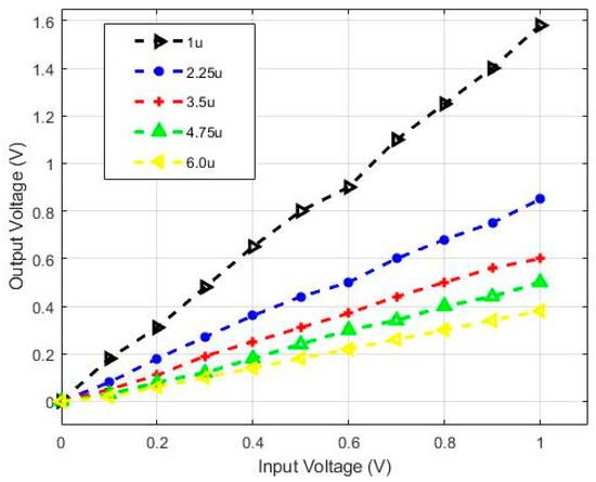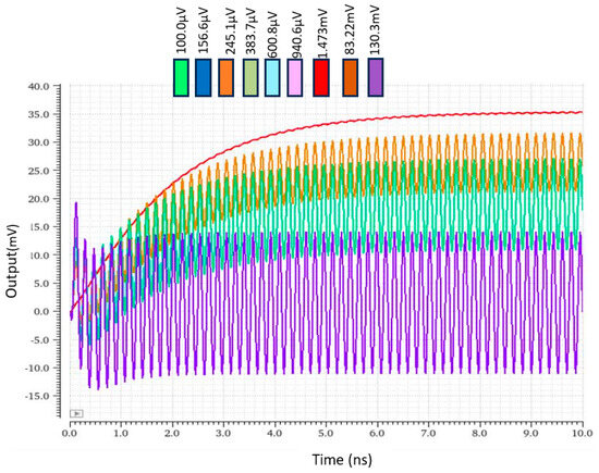 To understand the input requirements of the rectifier before integrating it with the limiting amplifier, its output response is simulated for various sets of input voltages. It can be seen in Figure 7 that as the input of the rectifier increases beyond 100 µV, the rectification is not particularly strong, which is the reason that the gain of the limiting cell is set to 0.3—in order to obtain the proper rectification of the input signal.