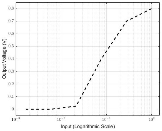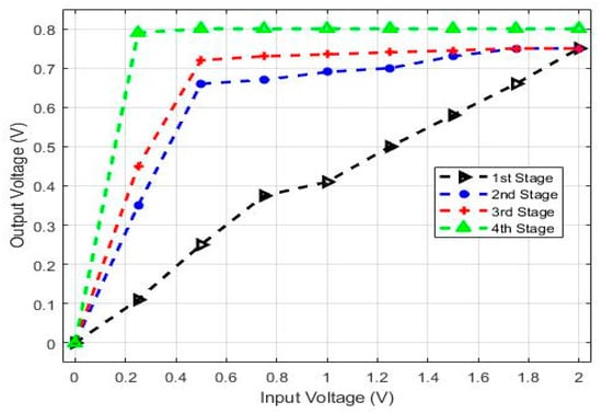 Figure 8 represents the output response to the changes in the input voltage in all the stages, individually. It can be noticed that the output saturates faster with every additional stage, creating the desired logarithmic behavior (Figure 9). However, this behavior was observed when diodes were placed as rectifiers; hence, they have a very small dynamic range due to the required voltage drop across each diode. This means that the output must be greater than 0.7 V, which is why efficient full-wave rectifiers with high sensitivity are greatly desired.