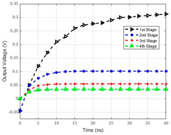 The proposed cascaded RSSI system shown in Figure 2 was simulated to study the response between its output and input. As observed from Figure 10, input levels greater than 83 mV start producing an output with AC behavior rather than a rectified output. Figure 11 shows the RSSI output after each stage, respectively, through which it can be inferred that the output saturates faster with every additional cascaded stage. This fast impulse response is a result of the linear-in-dB behavior from the piece-wise logarithmic amplifier, which leads to the desired fast settling time. There is a slight delay due to the increased number of transistors in the propagation path.