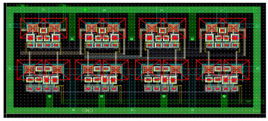 The proposed RSSI layout for this work, using a TSMC 65 nm GP process, is shown in Figure 12, where four cascaded limiting stages are followed by four full-wave current rectifiers in a successive-detection format. The output currents from all four full-wave current rectifiers are summed and the output is obtained from the low-pass filter, which is connected externally. The total area consumed by the layout, without the input/output pads, is 0.008 mm2.