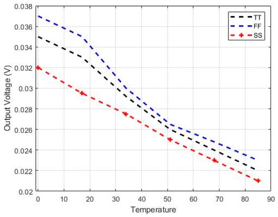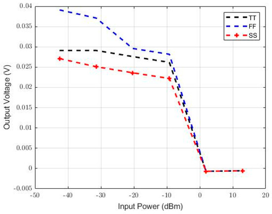 The Vout vs. Vin behavior of the schematic simulation and post-layout extracted simulation is shown in Figure 13. We can observe that the desirable linear-in-dB behavior is present in both simulations. Figure 14 represents the RSSI output of the schematic simulation and post-layout extracted simulation. It is clear that the settling time slightly increased in the post-layout simulation. Figure 15 and Figure 16 represent the thermal and process variations in the output voltage. Temperature variation (Figure 15) was simulated between 0 and 85 °C for three process variations: FF (both NMOS and PMOS have high doping), TT (both NMOS and PMOS have typical doping), and SS (both NMOS and PMOS have minimal doping). The output voltage for each input voltage for all three processes, as mentioned earlier, is presented in Figure 16, with logarithmic input scaling, so as to show the logarithmic behavior of the RSSI circuit.
