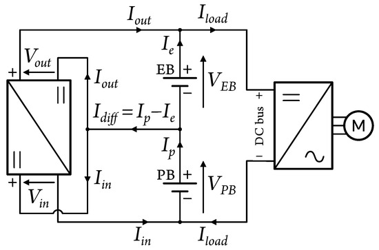 Equations (2) and (3) are combined in (5) to determine the power processed by the converter, which can be written as a function of the power supplied by the EB (6) or by the PB (7). It is therefore given by the voltage difference between the sources, the load voltage, and the power supplied by one of the batteries.