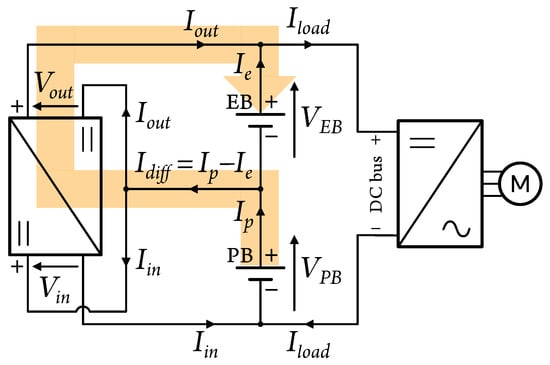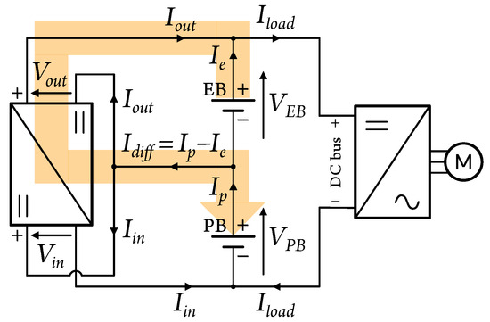 Figure 5 shows the operating mode in which the converter transfers positive power from to . When used in the discharge phase (EV acceleration), the power supplied by the PB increases, being made up of its contribution to the load plus a portion destined for the EB. This means that the power processed by the EB decreases and it discharges less quickly. At the same time, the power processed by the PB increases, accelerating its discharge. In the recharging phase (EV braking), this mode of operation speeds up the recharging of the EB and slows down that of the PB.