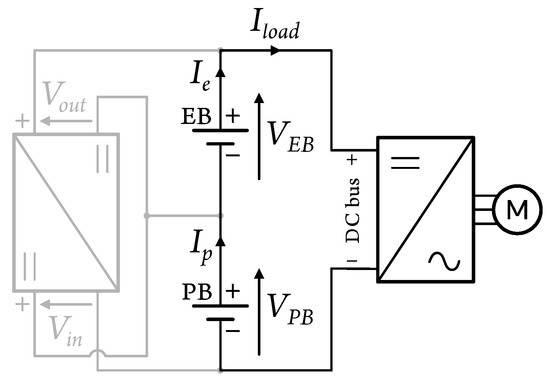 The schematic diagram of the series architecture is shown in Figure 4. In this solution, the power is “naturally” distributed between the batteries via the distribution of their voltages, with their sum being equal to the DC bus voltage and their current being the same without the action of the converter. The power supplied to the EV is equal to the sum of the power supplied by the batteries. The battery with the highest voltage corresponds to the one supporting the highest power. Therefore, the DC-DC converter job is to balance the batteries SOCs while preserving their current limits.
