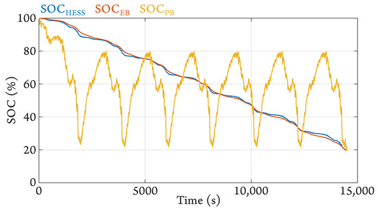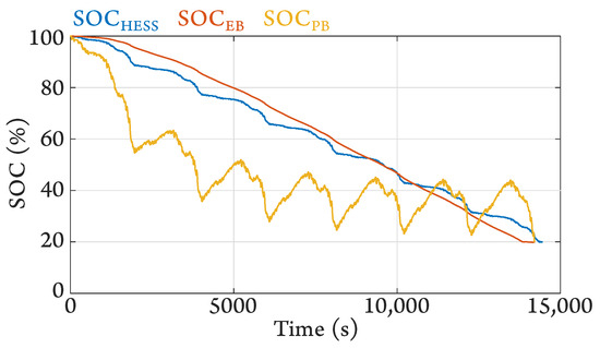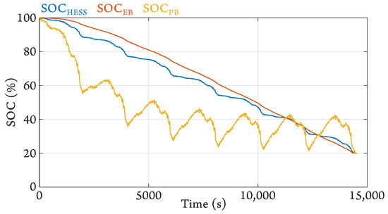 The evolution of the SOCs for this pair (Table 2) is shown in Figure 11. In this case, the PB carries only 3.4% of the HESS energy. The discharge depth of this battery is therefore greater. Nevertheless, the management strategy works as expected and the batteries discharge proportionally.