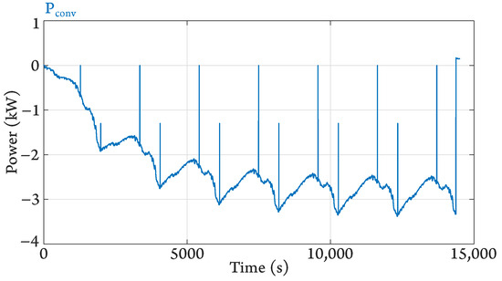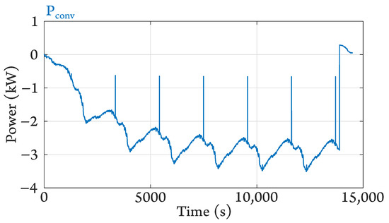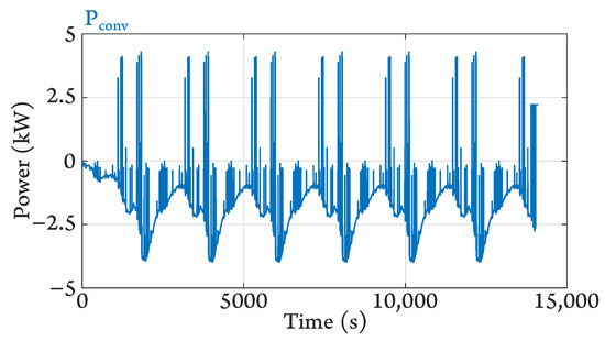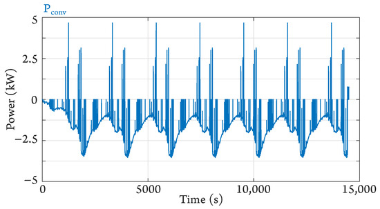 Finally, Figure 15 shows the power processed by the converter. A slight difference in the amplitude can be seen. In particular, at the end of the cycle, the power is positive. This is due to the fact that, at this point in the cycle, the EB is discharged and the cycle ends with the operation exclusively on the PB. The converter must then supply the EB with the power it should have provided, had it not been prematurely discharged. Including the resistances introduces a slight increase in the converter sizing power, from 3.38 kVA to 3.60 kVA.