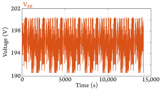 In this case, the PB energy is much lower. As a result, it discharges more quickly. Since electric braking is only partial, the range of the EV (Figure 16) is reduced. The variation in the EB voltage is shown in Figure 17.