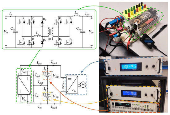 The converter used is an Infineon evaluation board model EVAL_3K3W_BIDI_PSFB [28]. It is based on a Phase-Shift Full-Bridge (PSFB) topology that consists of two full bridges, in which the legs of the first bridge work in phase shift while the second bridge works in synchronous rectification with the reference leg of the first bridge [29,30]. However, some modifications had to be made so that the converter is current-regulated rather than voltage-regulated [27]. Other than that, its nominal power of 3.3 kW is in the order of magnitude of the sizing powers obtained in the simulation for the Panasonic–A123 pair with 100% regenerative braking (Table 1). In addition, the battery voltages of this pair are compatible with the converter operating voltages (Table 3). For these reasons, this combination was chosen to be emulated by the power supplies.