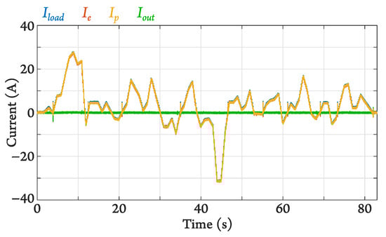The current profile applied corresponds to 81 s of the simulated cycle, around the 10,000 s mark. In this interval, at ¼ of the simulation power, the converter must process a SOCs balancing current of −10.2 A for the EB to support the PB. In real conditions, this current would be generated by the batteries SOC management algorithm.