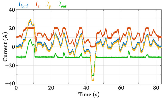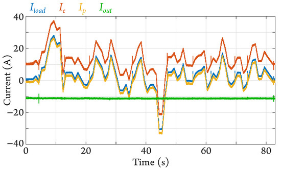 A first test was carried out with the converter disabled and is shown in Figure 20. In this case, since no current is processed by the converter, the battery currents are equal to that of the load. In a real system, the EB would have its current limited to −15 A, which would also limit the current processed by the PB and the recovery of braking energy.