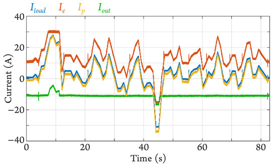 In a second test, shown in Figure 21, the converter was enabled and processed a constant current of −10.2 A. This test shows how the converter makes the EB process more current, compared to the test in Figure 20, to provide energy support to the PB. This way, the PB processes less current and would tend to discharge less quickly. In this test, the EB current limitation has not yet been implemented in the converter control.