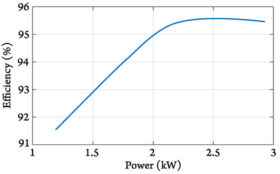 In order to also compare efficiencies, the converter used for the classic cascade architecture in [18] is considered as well as the Infineon evaluation board [28] for the series solution. The efficiency of the converter in the classic architecture has been estimated at around 98%. In order to measure the efficiency of the series architecture PSFB converter, tests were carried out. Voltages between 200 and 400 V and 20 and 50 V were applied to the input and output, respectively. The converter, being current-regulated, meant that different reference values were tested, corresponding to different power values. These tests have resulted in an efficiency of 95.5% at rated power (Figure 24).